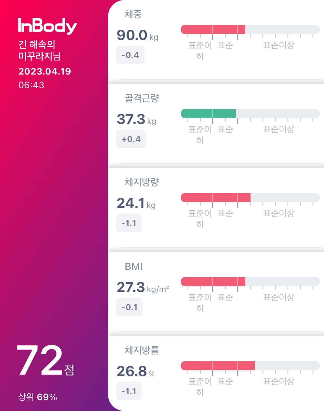 - 어제 좀 걸어서 그런지 골격근은 증가한 것 처럼 표현이 되고, 체지방량은 다소 감소한 것처럼 나왔습니다. (물론 음주로 인한 탈수로 오차가 생긴것일수도 있으니 일단 내일까지는 봐야할 것 같아요.)